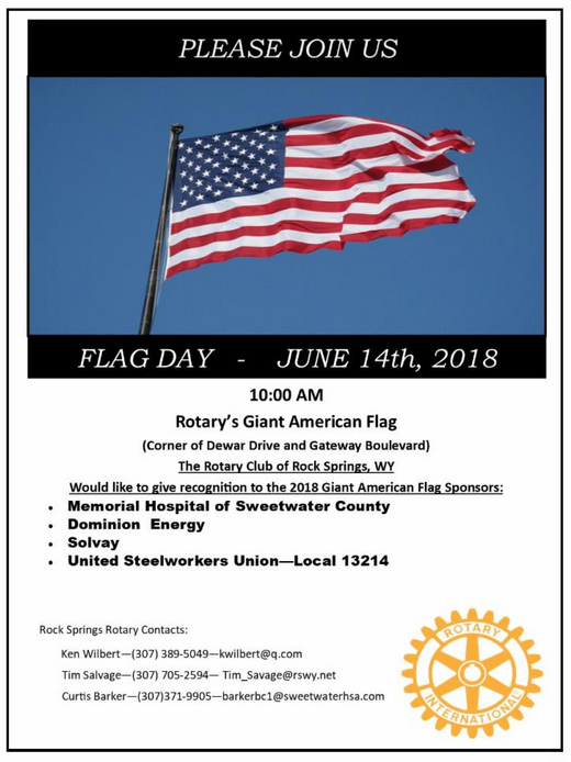 In honor of Flag Day, the Rock Springs Rotary Club is hosting a special recognition ceremony at 10 am on June 14 at the flag pole. The sponsors of the 2018 Giant American Flag will be recognized for their contribution.