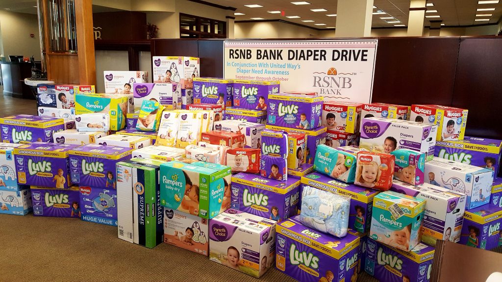 RSNB Bank collected the diapers in partnership with the United Way. The local diaper bank, much like the food bank, will distribute the diapers to needy people in the area.