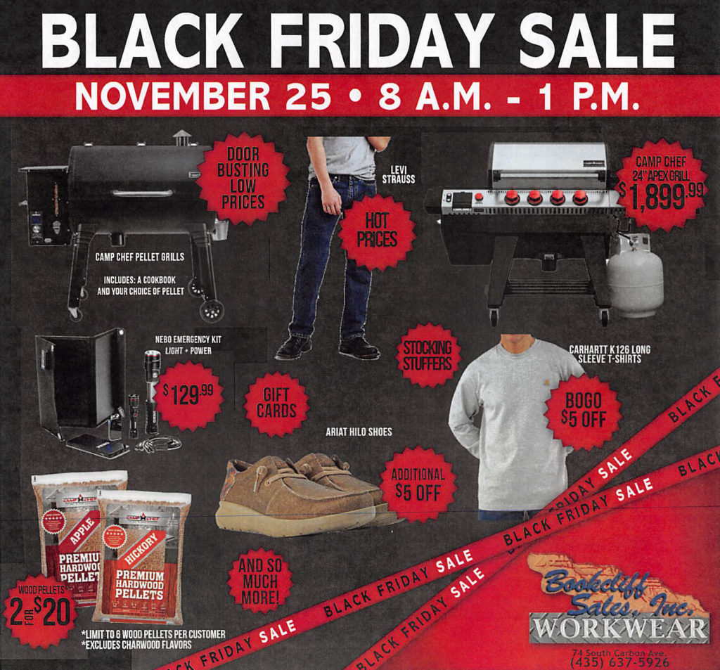 Stop by Bookcliff Sales at 2028 Sunset Dr. in Rock Springs on November 25th and enjoy savings on workwear, outdoor supplies and more!