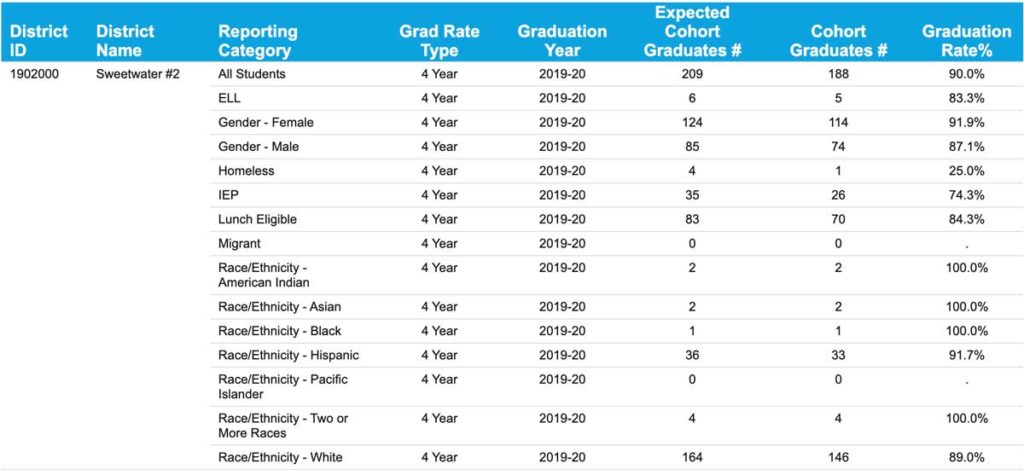 Locally, Sweetwater County School District No. 1 (SCSD No. 1) saw a 4 percent increase in its graduation rate from the 2018-2019 school year. Sweetwater County School District No. 2 (SCSD No. 2) saw a 3.5 percent decrease in its graduation rate, but remained at 90 percent. SCSD No. 2 joined 17 other districts with a graduation rate of 90 percent of higher.