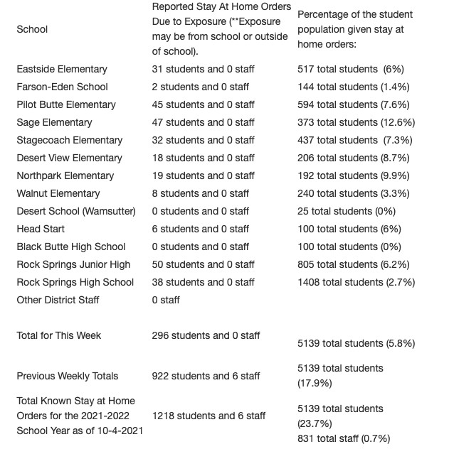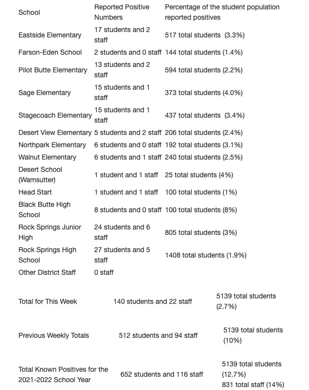 ROCK SPRINGS — Sweetwater County School District (SCSD) No. 1 is reporting 162 new positive COVID-19 cases since the last COVID-19 update on January 21.