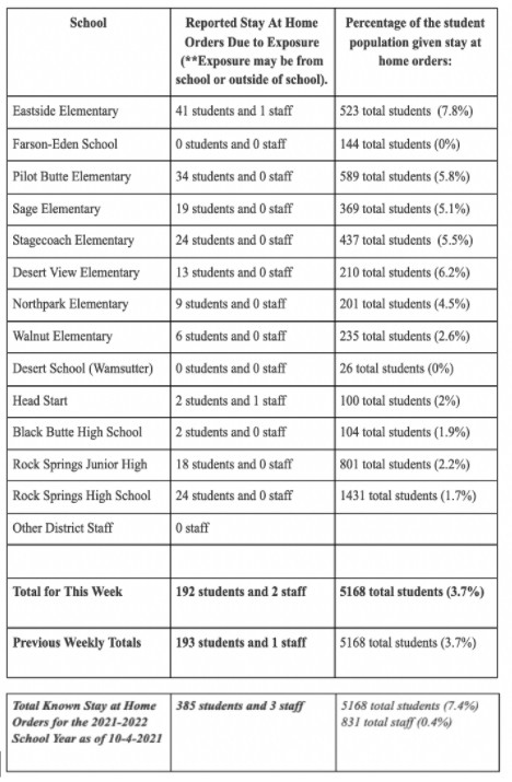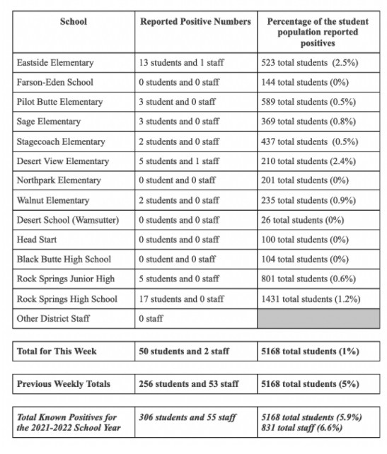 According to a ParentSquare post from SCSD No. 1 Superintendent Kelly McGovern, the District has seen 50 students and two employees test positive for COVID-19 in the last two weeks. According to the data, Eastside Elementary School and Rock Springs High School are seeing the highest number of COVID-19 cases with 13 students at 1 employee and 17 students respectively.