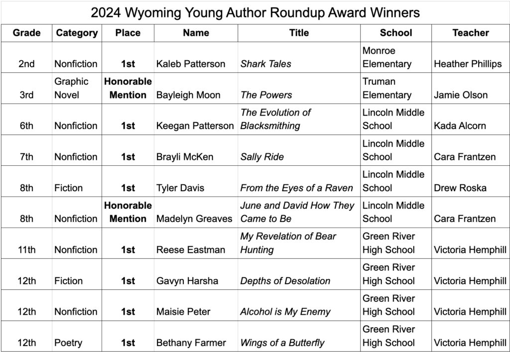 GREEN RIVER — Eight students from Sweetwater County School District No. 2 emerged victorious at the state 2024 Young Authors competition, with two additional students receiving honorable mention recognitions.