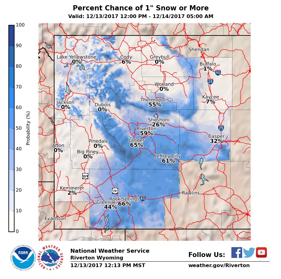 SWEETWATER COUNTY — The National Weather Service in Riverton is forecasting a 66 percent chance of Rock Springs receiving an inch of snow or more between 5 am today and 5 am on December 14th.