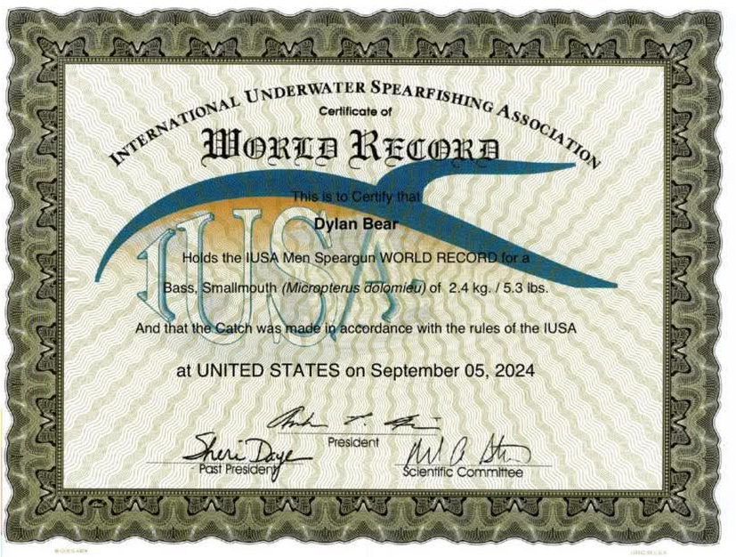“After over two hours of diving and being very selective, I saw a small school and a few medium size smallmouth, so I dropped down to 20 feet, scratched a rock to mimic the sounds of crawdads, relaxed my body and waited until I saw three medium fish coming in, behind them was a dark shadow,” Bear said. “Avoiding eye contact, with my spear gun in front of me, I waited for the fish to swim in front of my spear and then landed a shot through both gill plates. Securing the fish, I soon realize that the girth, the color, and the length of this fish was that of an old and healthy smallmouth.”