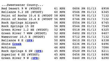 Portions of Sweetwater County reported high wind gusts yesterday. The Red Desert area reported a 61 mph wind gust, while Reliance reported a 60 mph gust. Both the Southwest Wyoming Regional Airport and southeast Rock Springs reported a 56 mph gust. Green River reported 52 mph wind gusts.