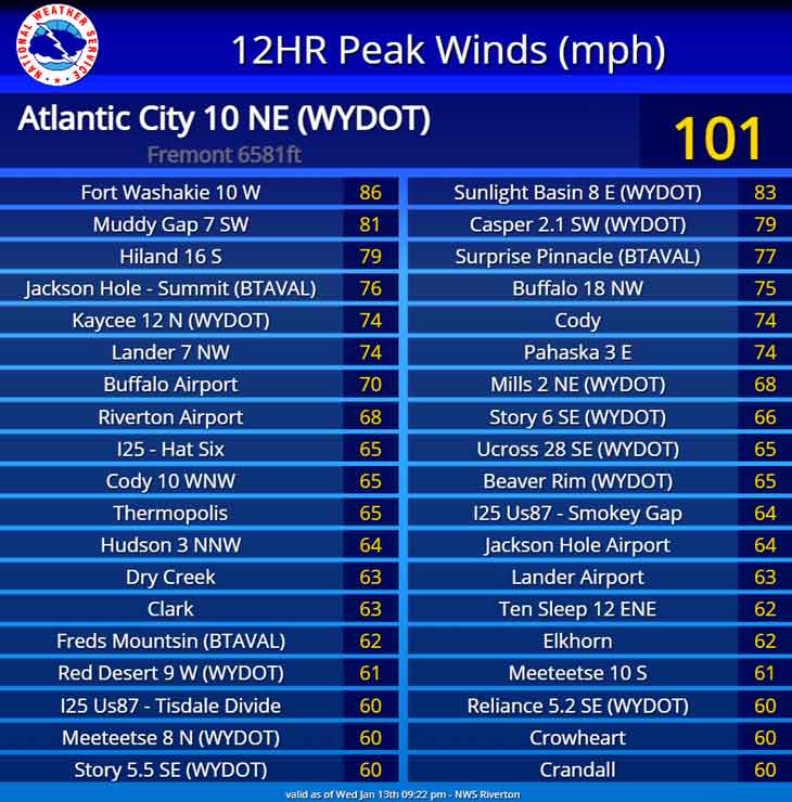 Atlantic City reported the highest wind gust in the state at 101 mph! Fort Washakie reported an 86 mph wind gust and Muddy Gap reported an 81 mph gust.