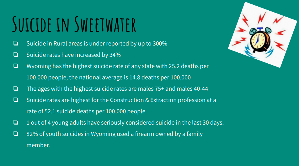 ROCK SPRINGS — The Sweetwater County Prevention Coalition (SCPC) provided the community with some startling Wyoming suicide statistics in an effort to inform Rock Springs residents about suicide and what prevention efforts are in place already.