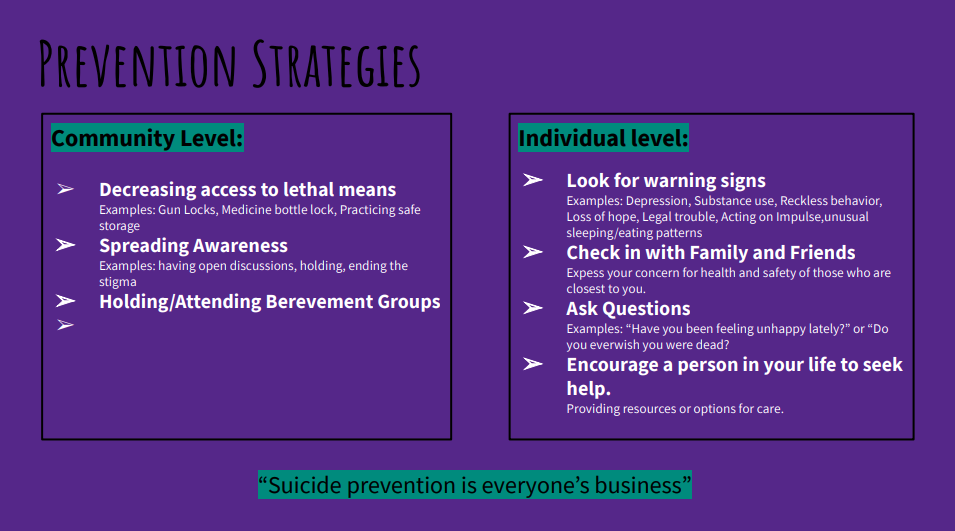 The prevention specialists also provided information on suicide hotlines for those who feel they need to talk to someone.