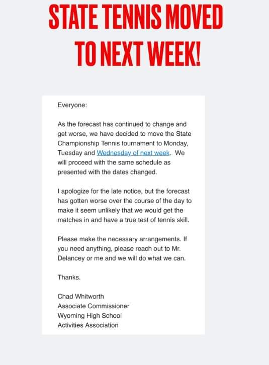 GILLETTE – The state championship tennis tournament has been postponed due to concerns about the forecasted weather. Teams were supposed to start tournament matchups Thursday, but the tournament was rescheduled to Monday. Here is Wyoming High School Activity Association’s post.