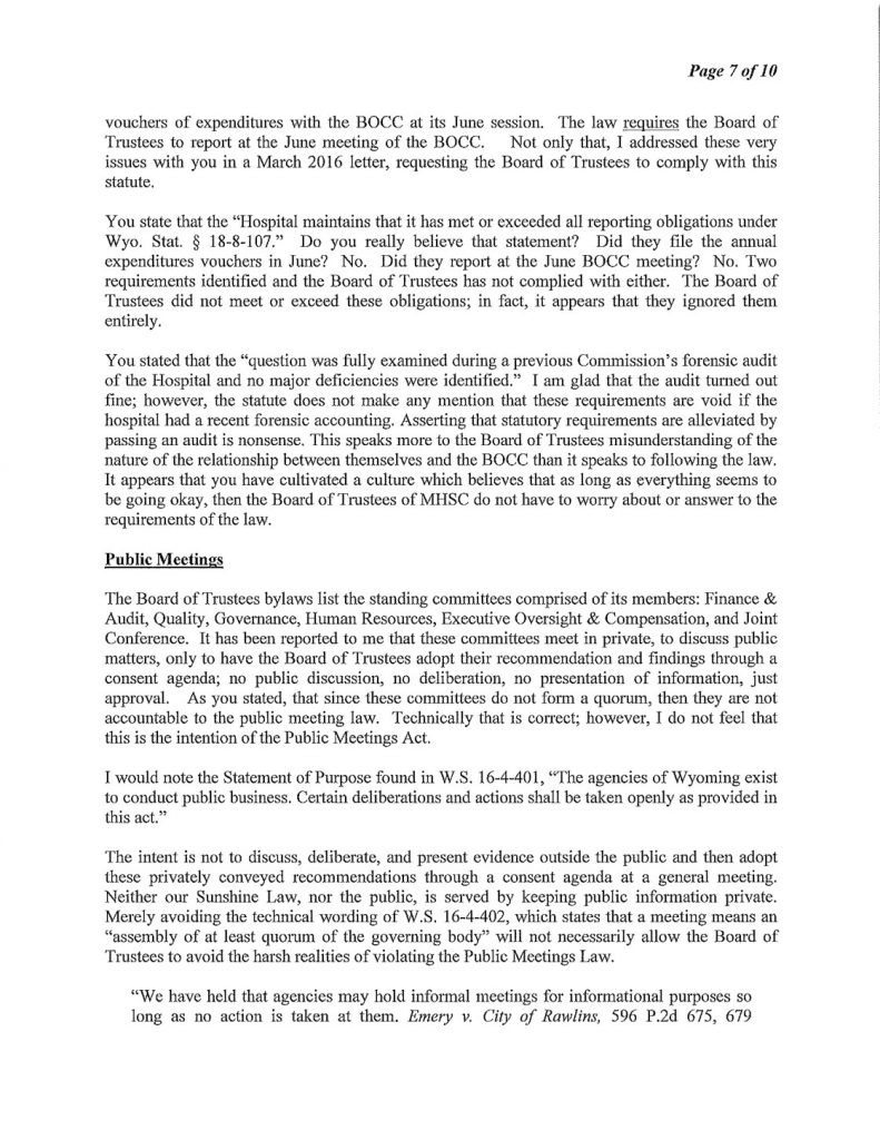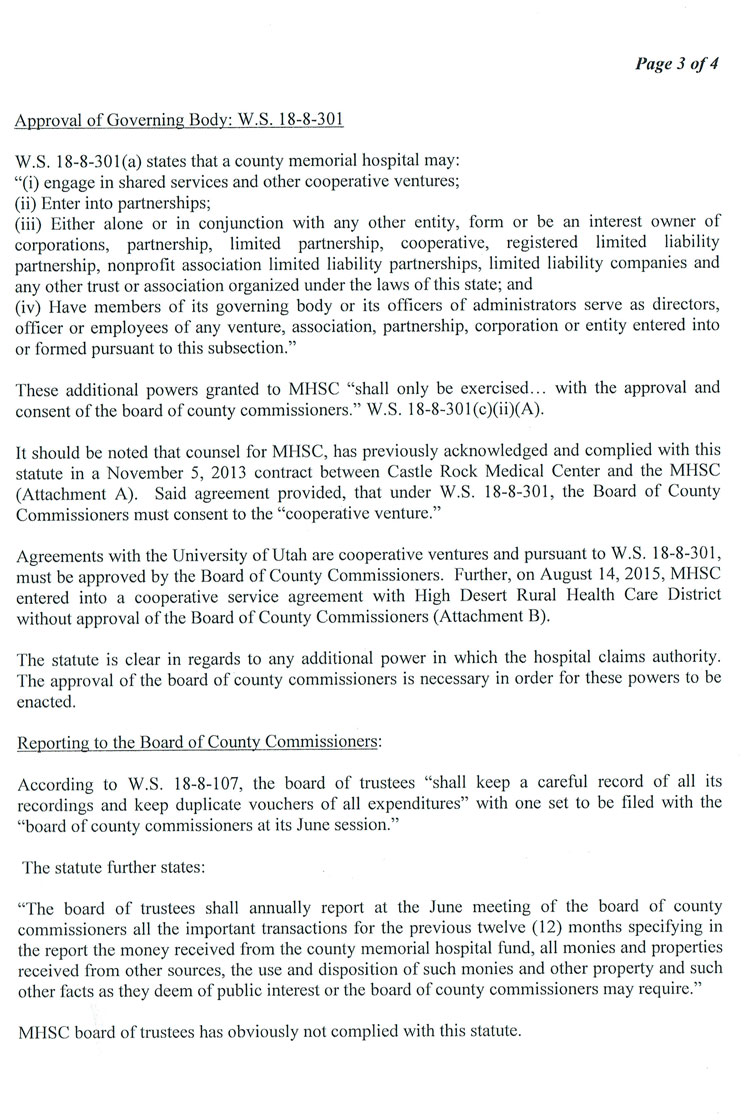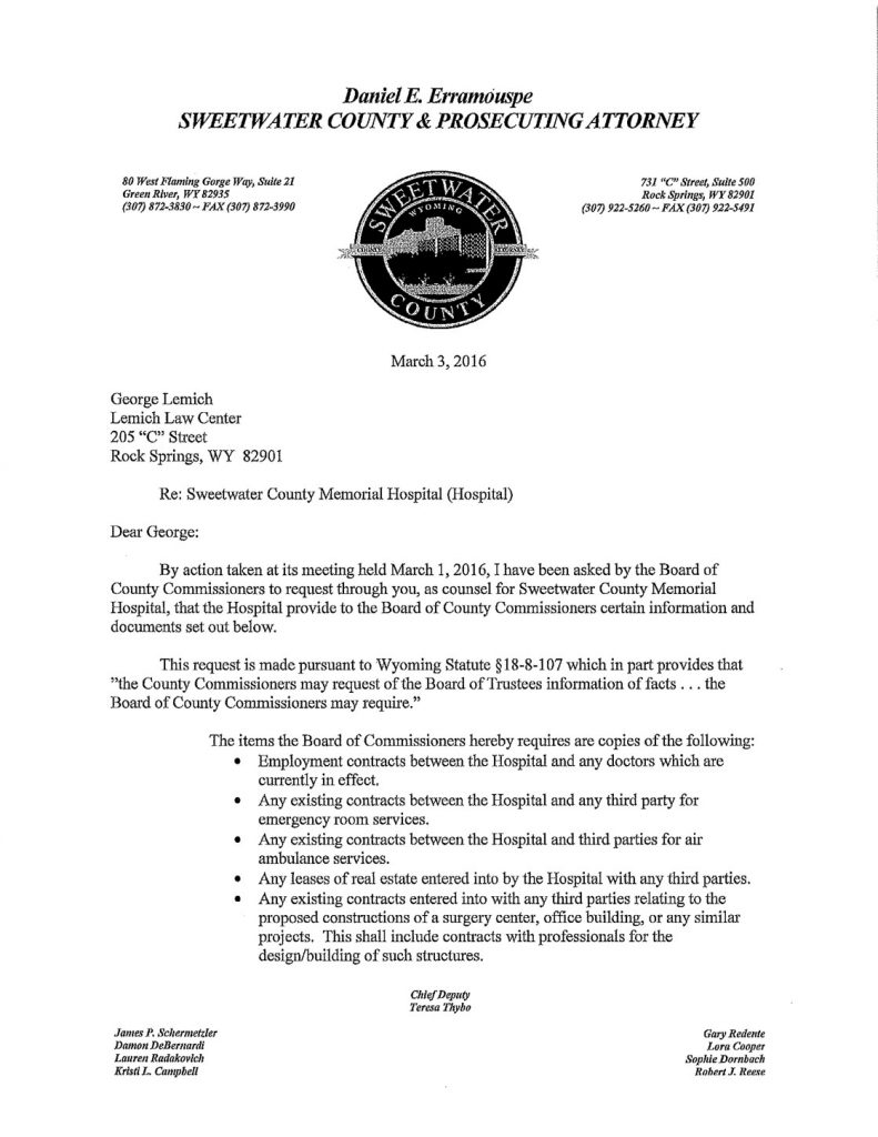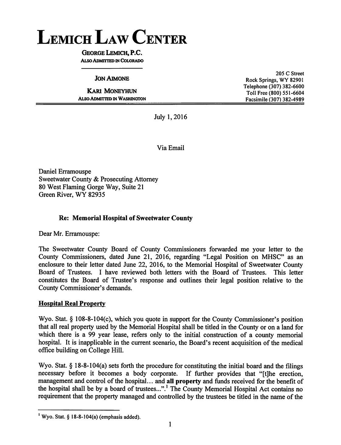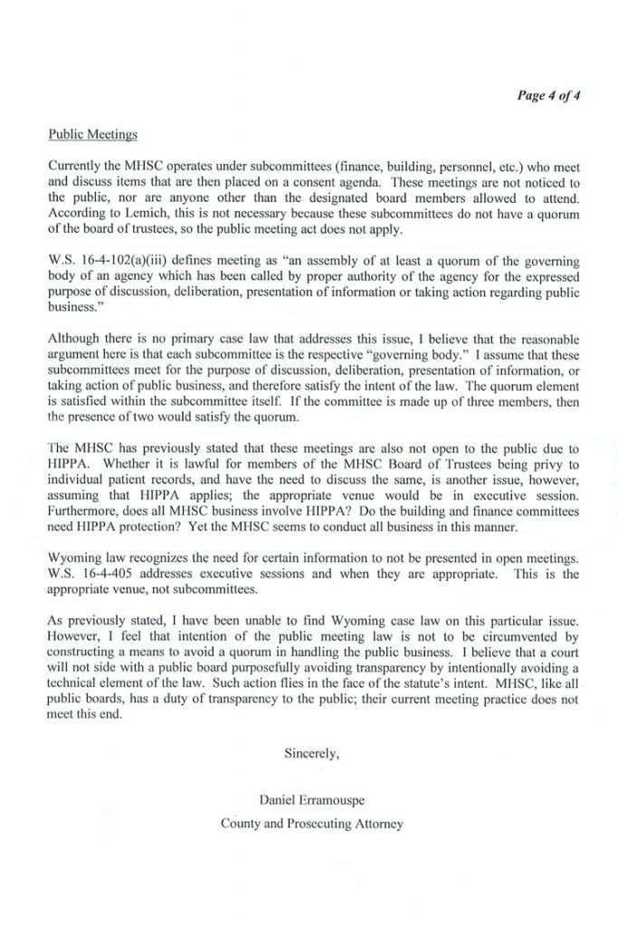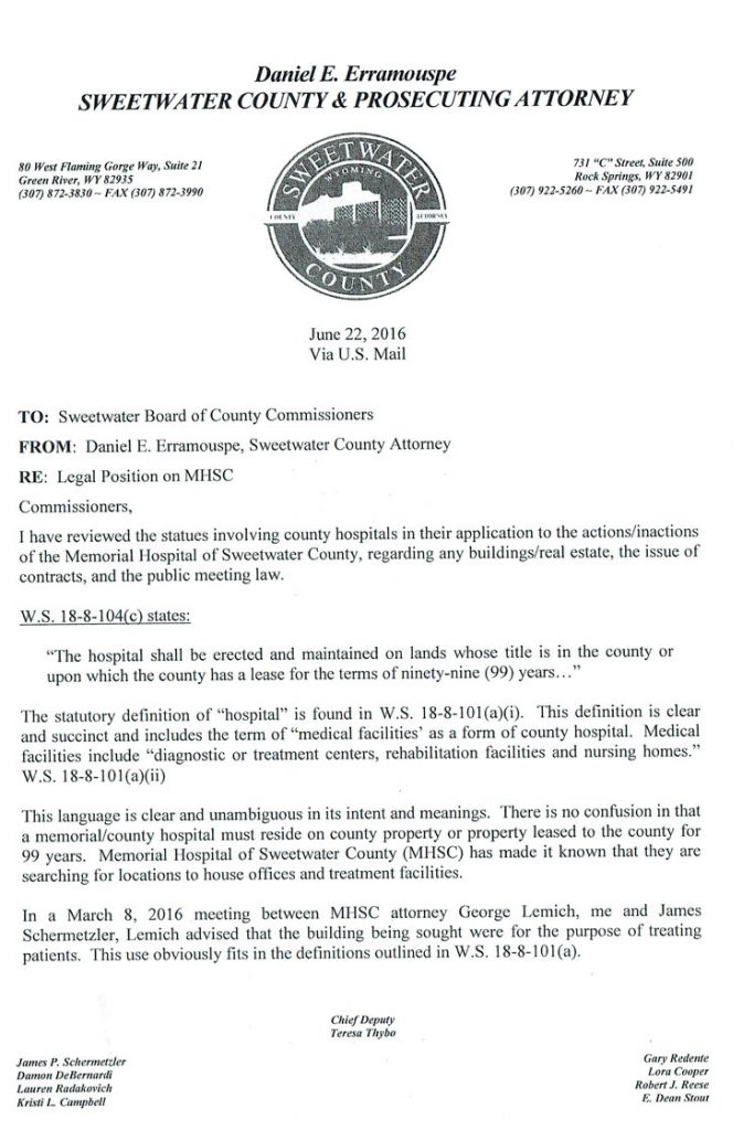 The Following is MHSC Attorney George Lemich’s response to Sweetwater County Attorney Daniel E. Eramouspe’s Original Opinion Letter Dated June 21, 2016