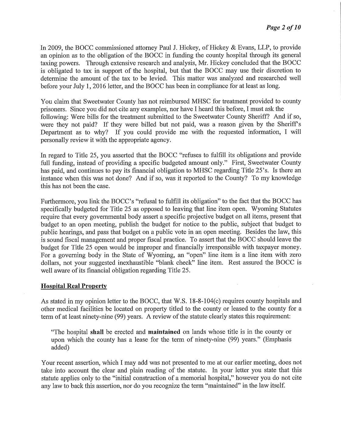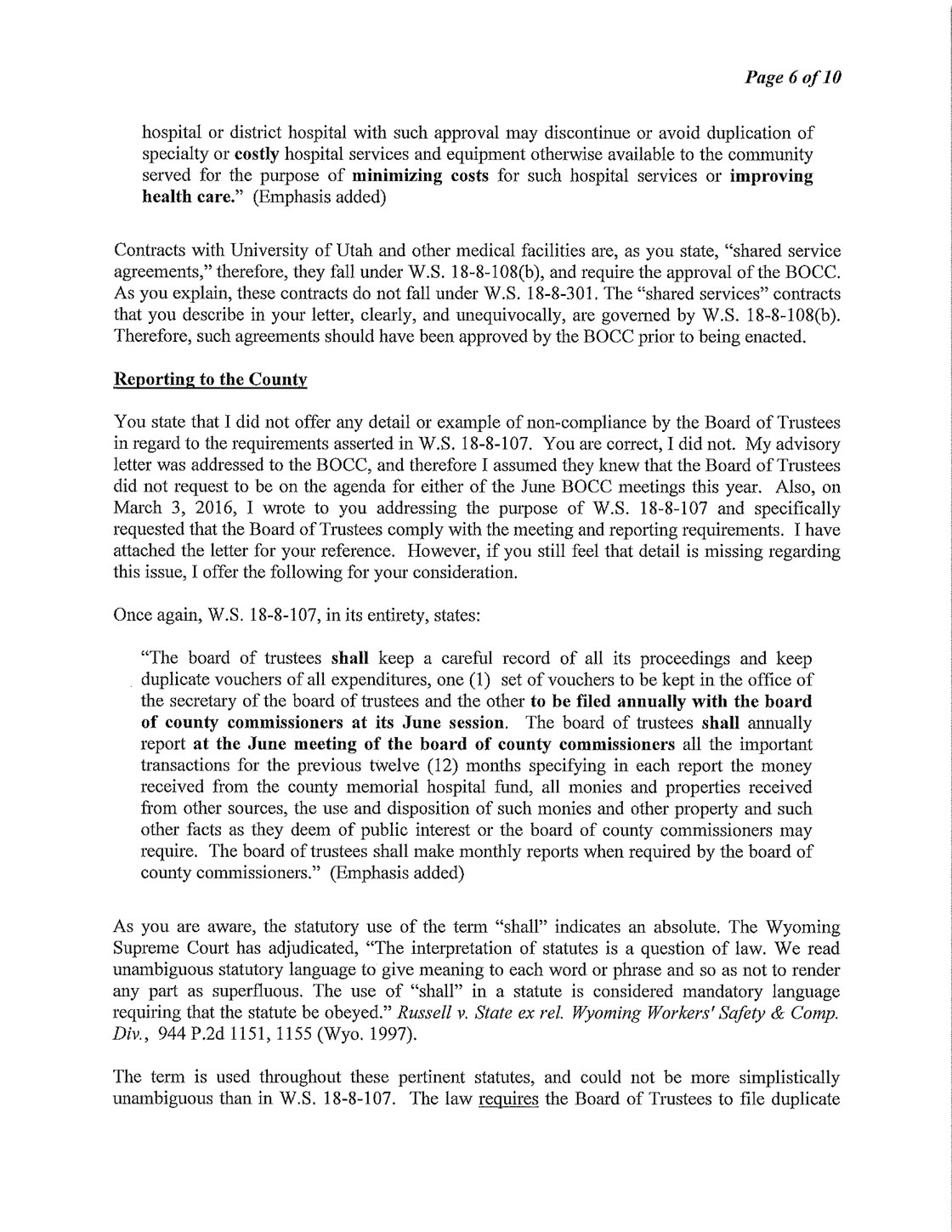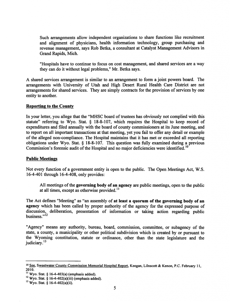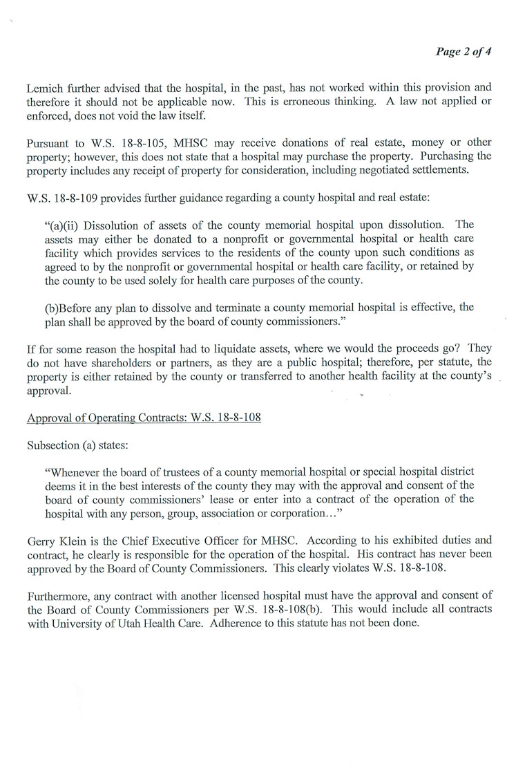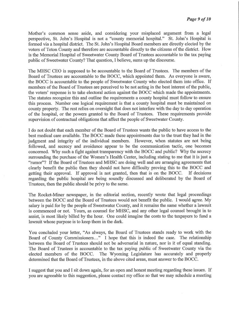 The Following is MHSC Attorney George Lemich’s response to Sweetwater County Attorney Daniel E. Eramouspe’s Original Opinion Letter Dated June 21, 2016