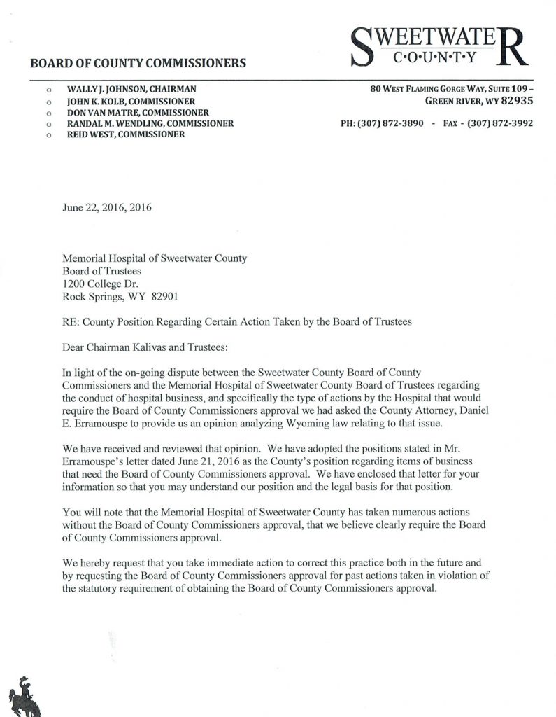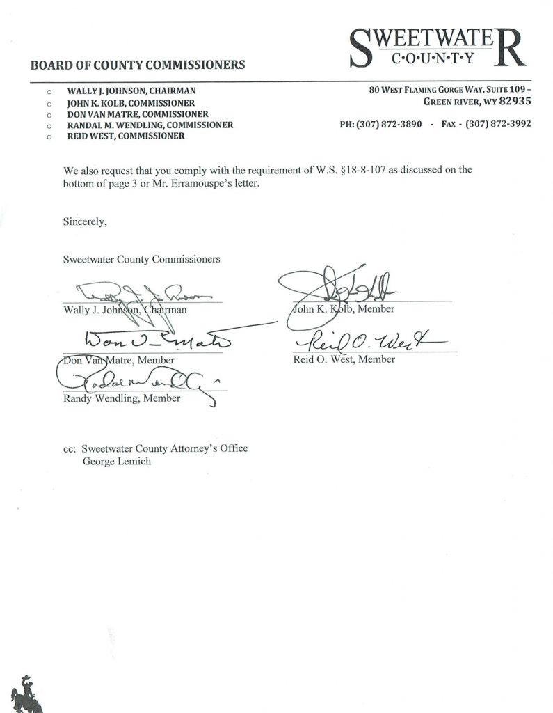 SWEETWATER COUNTY — The Sweetwater County Attorney Daniel E. Erramouspe has issued a response to the letter received by the Sweetwater County Board of County Commissioners dated July 1, 2016.