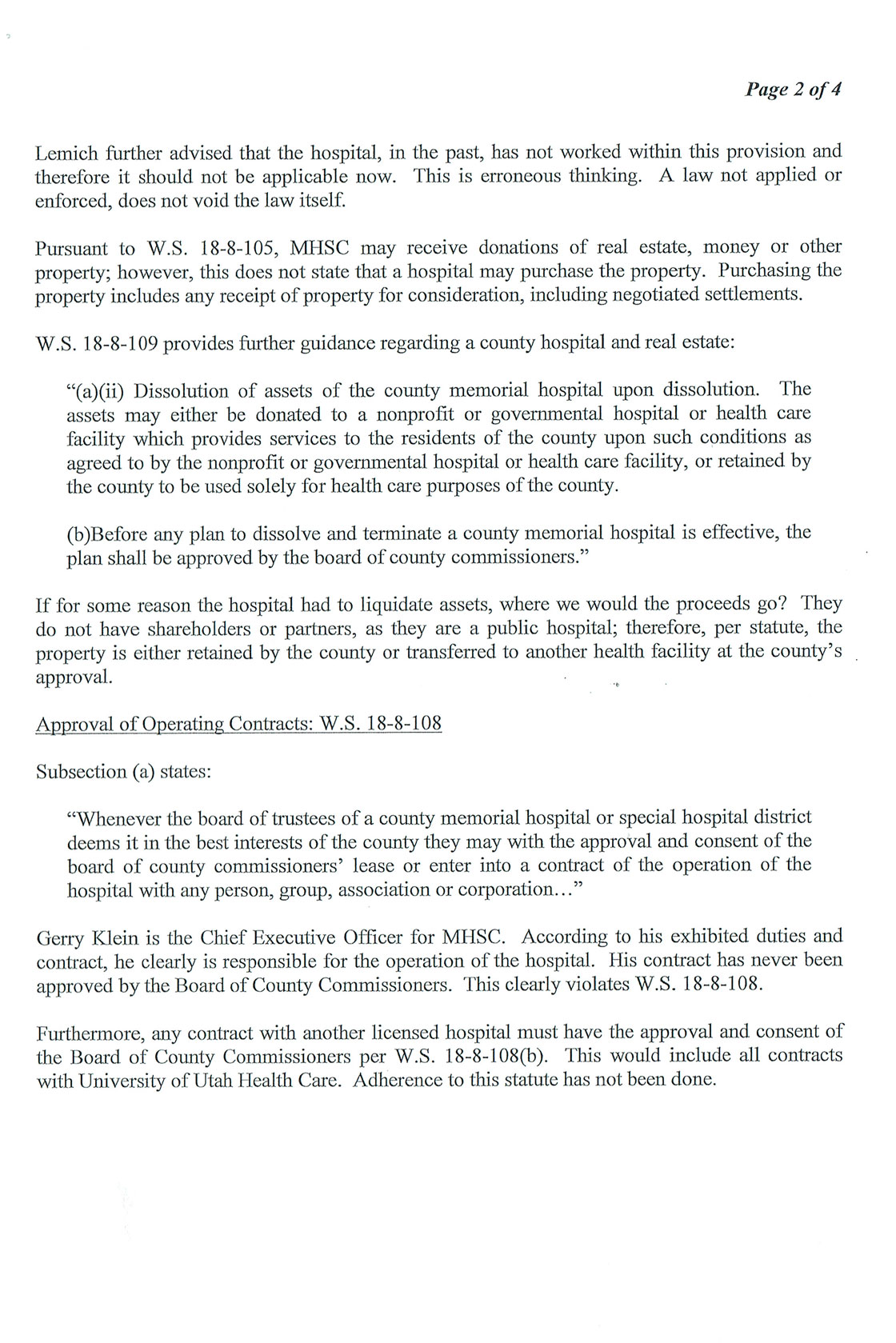 The commissioners see the issues as a violation of state statute, while Attorney George Lemich, who is the legal counsel for MHSC, frames the commissioners as overstepping their statutory bounds and intruding on the hospital’s mandate.