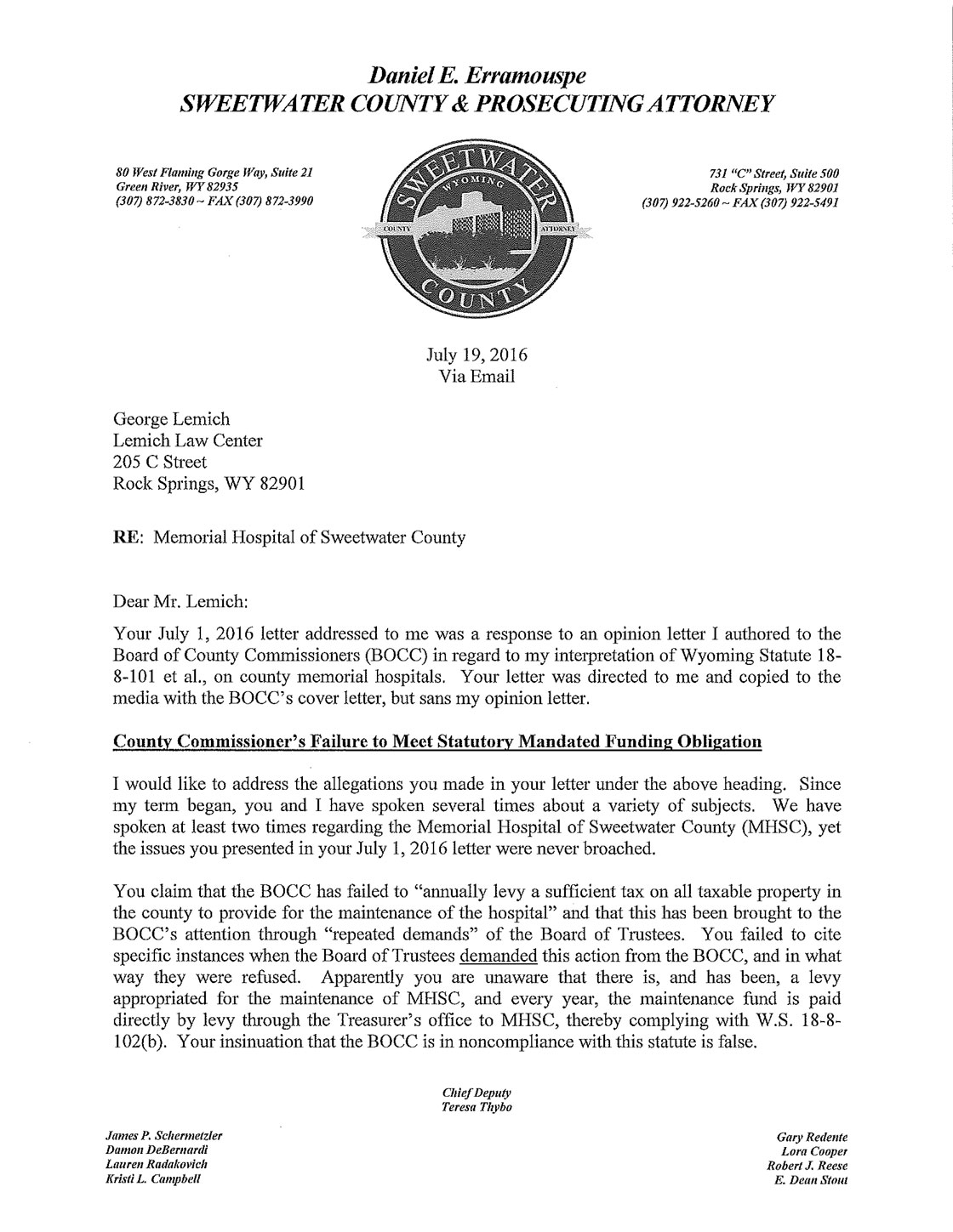 Sweetwater County Attorney Daniel E. Erramouspe’s Response Letter to the July 1st Letter Written By George Lemich.