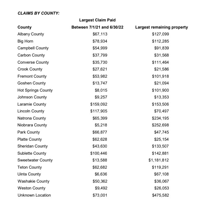 CHEYENNE — The Unclaimed Property Division of the Wyoming State Treasurer’s Office paid out more than $15.25 million in money and securities value during fiscal year 2022, which ended June 30. However, there are still a lot of unclaimed properties across the state and Sweetwater County has more than $5.5 million in unclaimed properties.