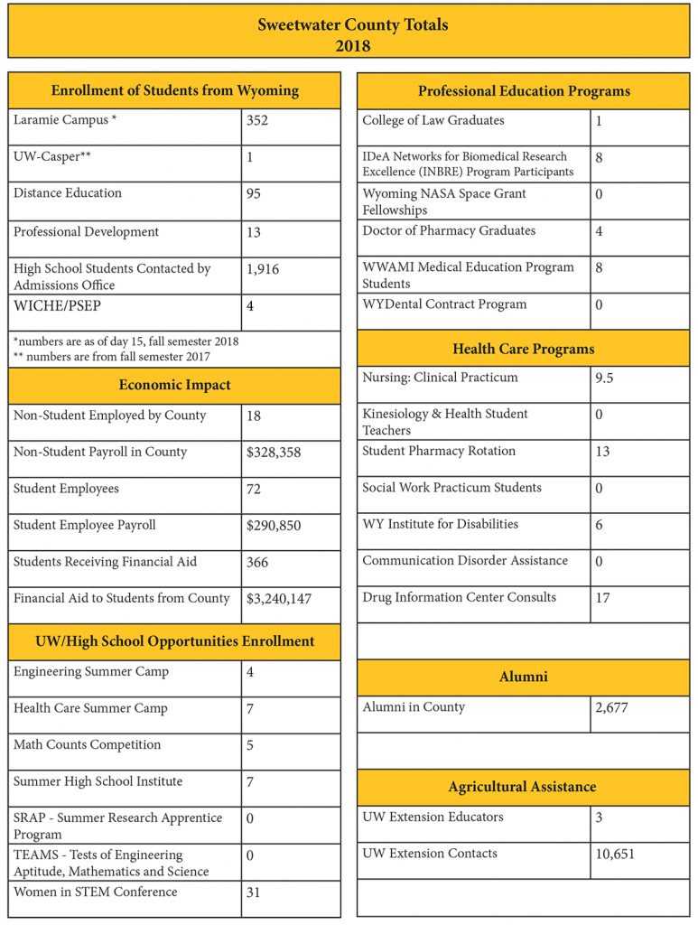 LARAMIE — University of Wyoming’s recently released a report on its interaction with the state’s 23 counties, including enrollment at UW, alumni, local educational programs and projects, and local economic impact.