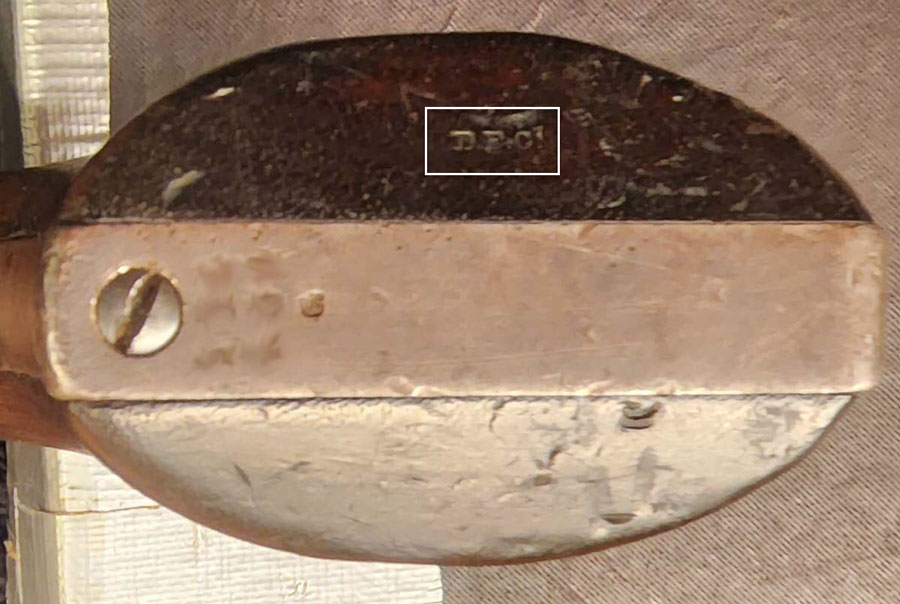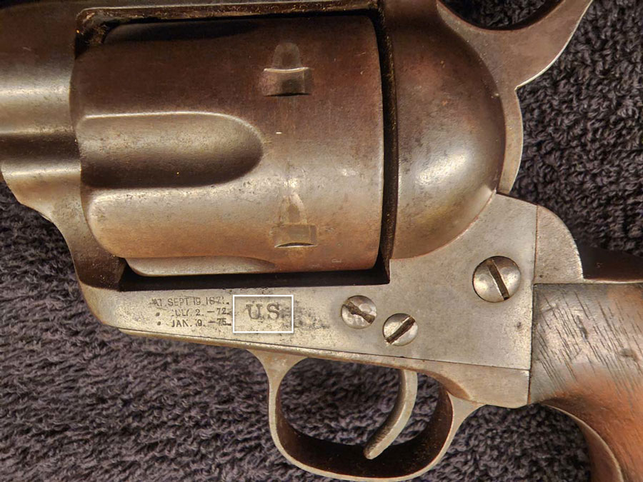 This Colt proved to be a military issue, as evidenced by the “U.S.” stamp on the left side of the frame. During that era, the practice was for a military sub-inspector to inspect all military firearms. These  sub-inspectors were civilian employees of the Springfield Arsenal. The bottom left-hand grip of this gun was noted to be stamped “DFC,” which were the initials of David F. Clark, the sub-inspector who examined it. Clark so served from 1880 to 1887.