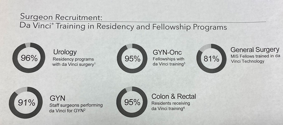 According to Marshall, surgeons working in the fields of urology, gynecology, colon and rectal care, and general surgeries, are all being trained on the daVinci robot in residencies and fellowships. The graph below shows the percentage of those currently being trained.