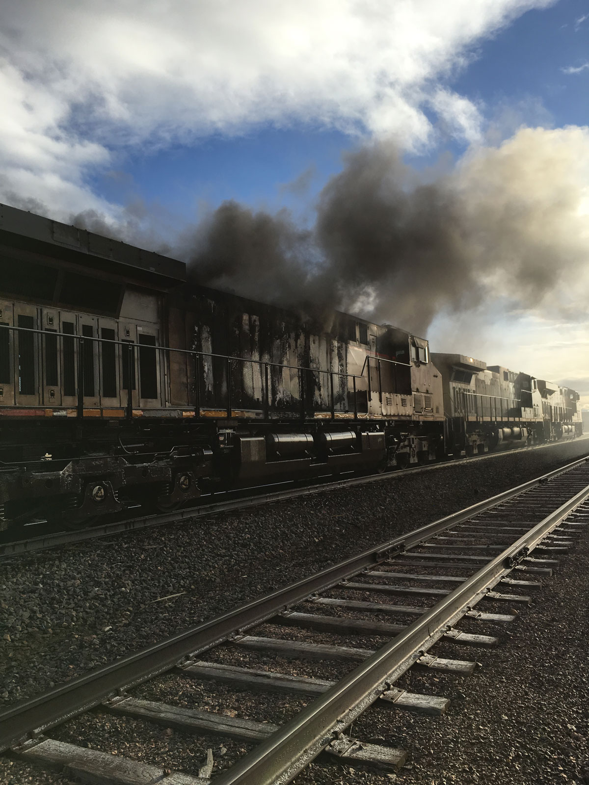 Upon evaluation, there was a Union Pacific locomotive third back from the lead locomotive with smoke and flames present coming from the engine compartment. The locomotive in question was located approximately 150’ from the rear of the Halliburton property with no easy access to the train.