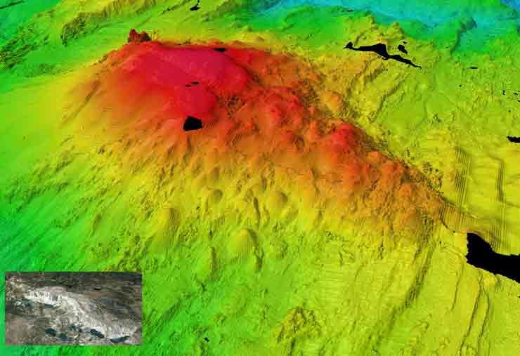 During the mapping — conducted at a resolution of 100 lateral feet — of some of the least explored seafloor on Earth, Cheadle and other researchers were able to view and study various faults, individual lava flows and volcanic eruption cones in great detail. The group also mapped a “push-up” ridge in a transform fault, which is a fault where two tectonic plates slide past each other, much like the San Andreas Fault.