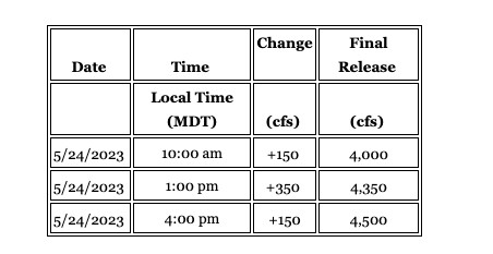 For the fifth week in a row, water releases have increased to accommodate for spring runoff. Based on increasing reservoir inflows, releases from Fontenelle Dam are scheduled to be increased from 3,850 cubic foot per second (cfs) to 4,500 cfs on May 24 beginning at 10 a.m., according to the following schedule.