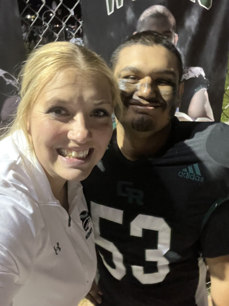 I’m on special teams, like kick off return, and I sometimes play defense. And I get the opportunity to help out with junior varsity, so that’s really fun. I really enjoy working with the younger kids and hanging out with them. I just really like interacting with everyone, and it’s really important to me to be a good role model to the younger kids.