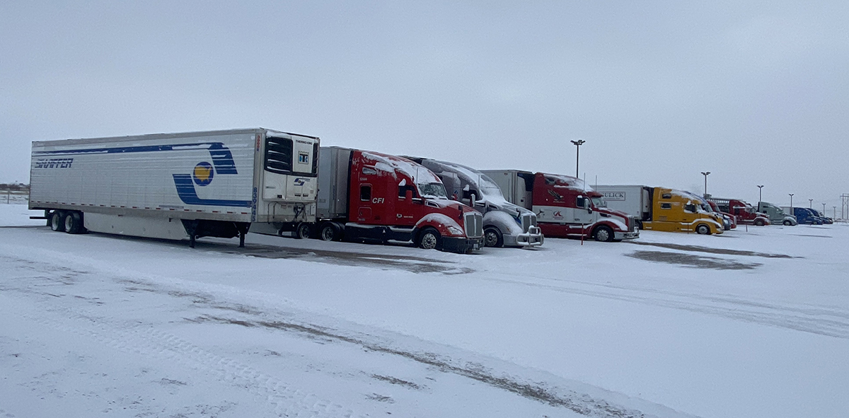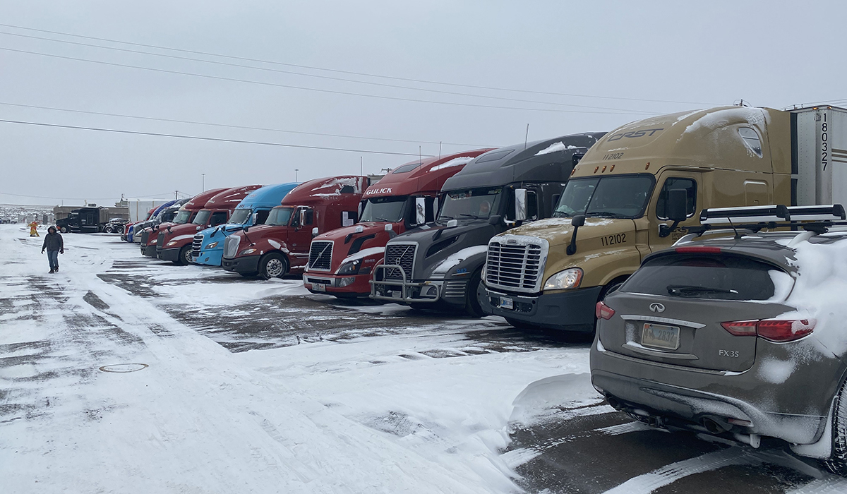 A line of semi truck drivers wait patiently at the Sweetwater County Events Complex for the interstate to open eastbound.