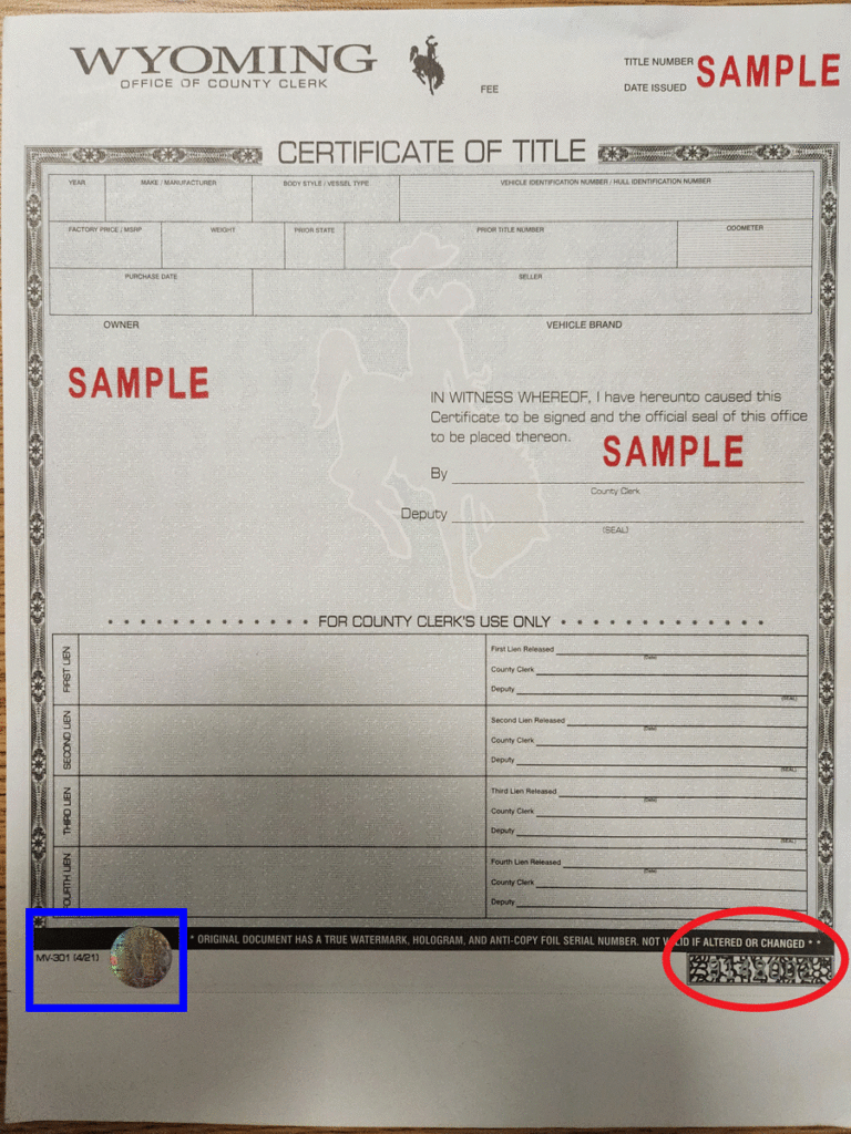 According to WYDOT, some of these blank titles, which have control numbers ranging from 8790001 to 8790500, have been used for criminal purposes in Colorado. The control numbers are located at the lower right side of the title in silver print with a security box around the number. On the lower left side of the title will be marked “MV-301 (4/21)” with a round silver security seal to the right of the text.