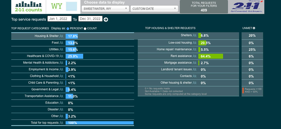 In 2022, Sweetwater County received 409 requests. Out of those requests, 25.9 percent were healthcare or COVID-19 related, 17.8 percent were seeking information on housing and shelter, 15.6 percent were related to utilities, 13 percent were food related, and 11 percent were asking about transportation assistance.