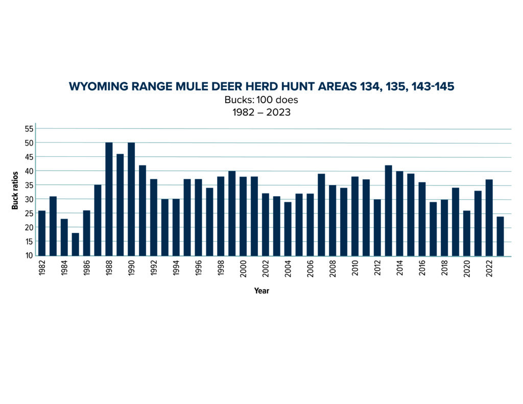 On a brighter note, the adjacent Sublette mule deer herd was not affected as strongly by the severe winter of 2022-23. Classification flights indicated total buck ratios of 34 for 100 does, and fawn ratios of 60 for 100 does. The buck and doe ratios were lower than average, but expected after a harsh winter.