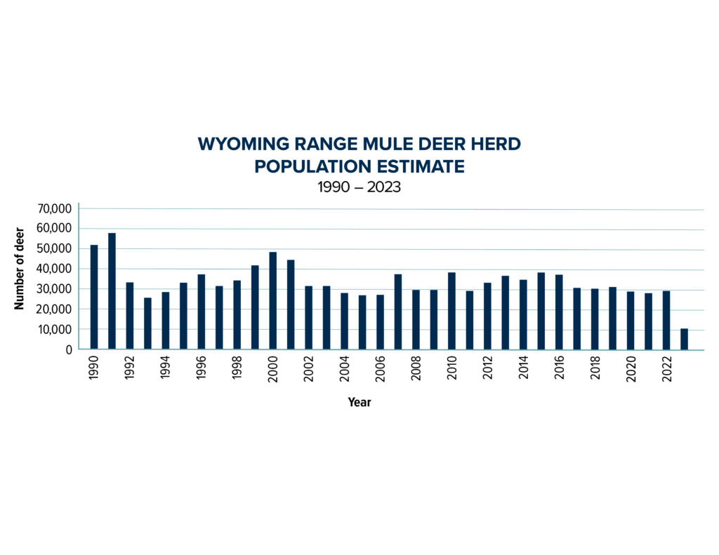 GREEN RIVER – Wyoming Game and Fish Department wildlife managers completed an aerial population survey of the renowned Wyoming Range mule deer herd, and now have a better understanding of how the 2022-23 severe winter impacted the population. Wildlife biologists estimate the current herd number to be about 11,000 animals — a considerable decline from the February 2023 estimate of 30,000 individuals.