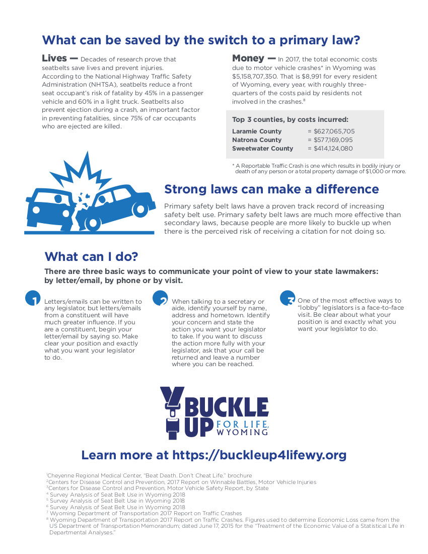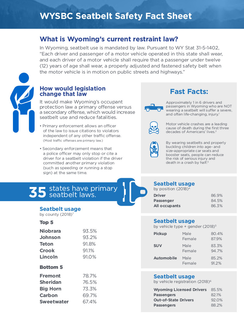 In 2018, a total of 111 people died in automobile crashes in Wyoming, which was down significantly from years prior. Between the years 2012 and 2016, 67,000 lives were saved by seat belts nationally.”
