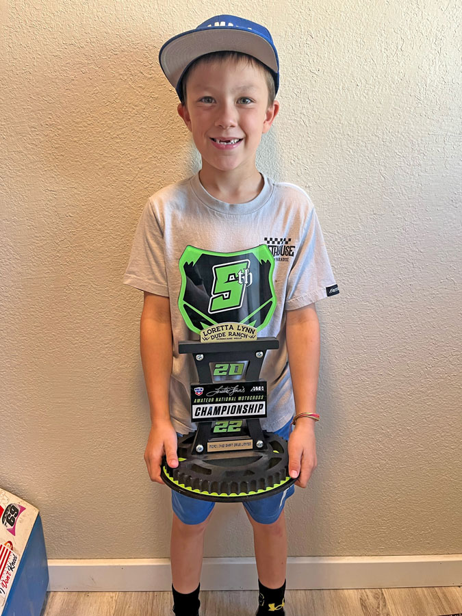 So far, one of the biggest highlights of SJ’s racing career is when he took fifth place overall in the Micro 1 (4-6) Shaft Drive Limited Division at the Loretta Lynn’s Amateur National Motocross Competition, which took place in Tennessee. In his first race at the national competition SJ took third. In the second race he was taken out, but battled back from 41st place to ninth. On the last day of competition he finished 14th, which gave him fifth place overall.
